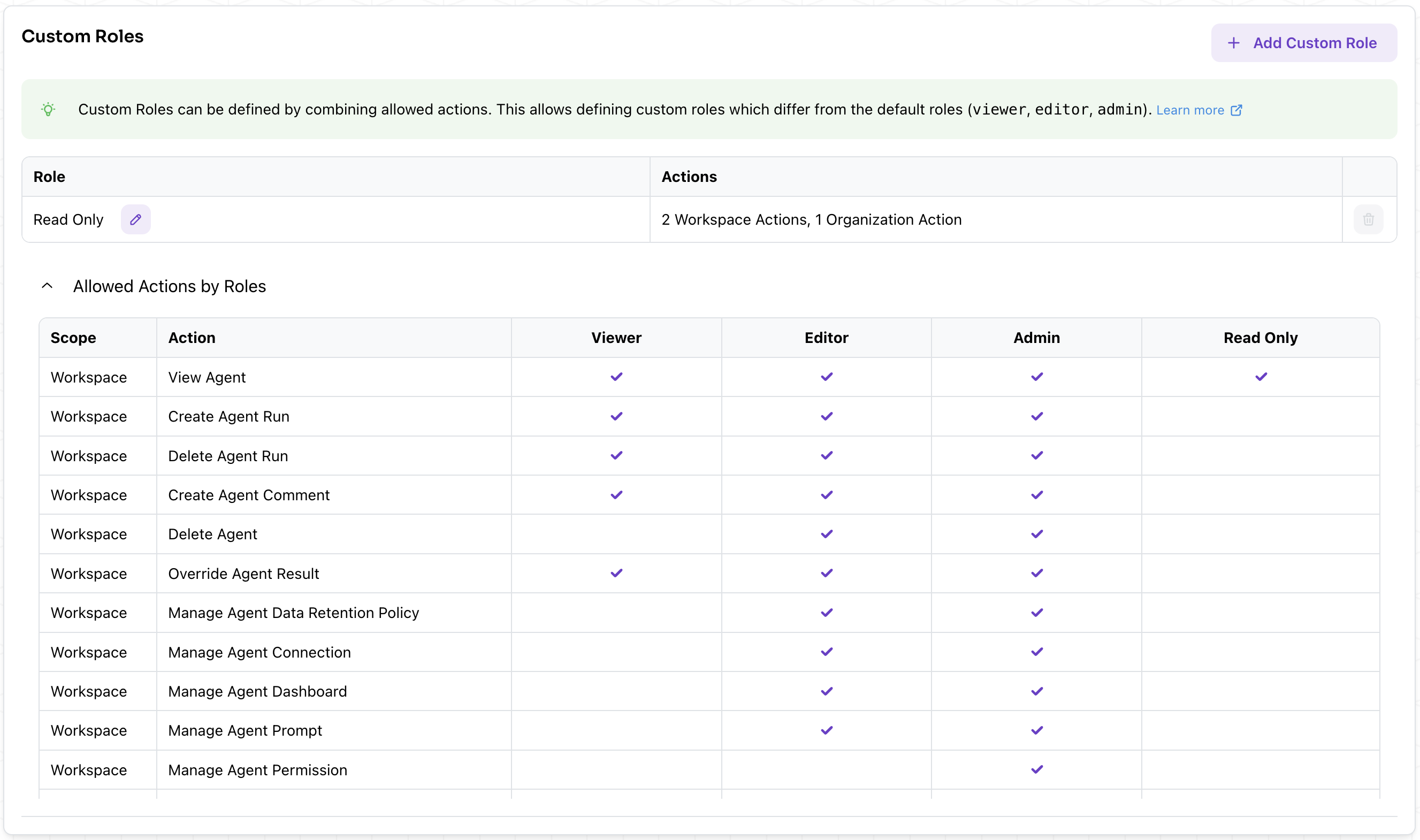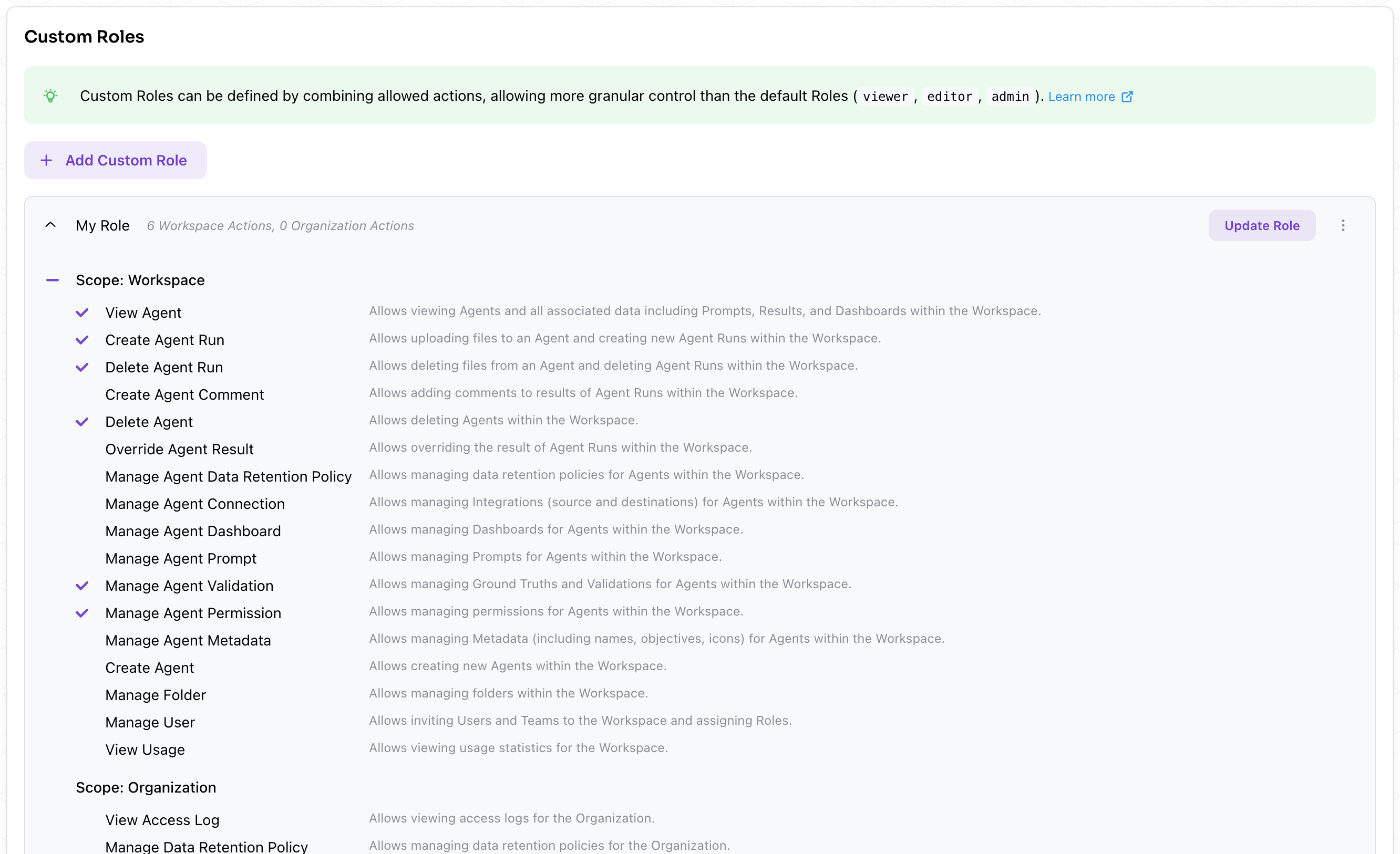 | Workspace | View Agent | Allows viewing Agents and all associated data including Prompts, Results, and Dashboards within the Workspace. |