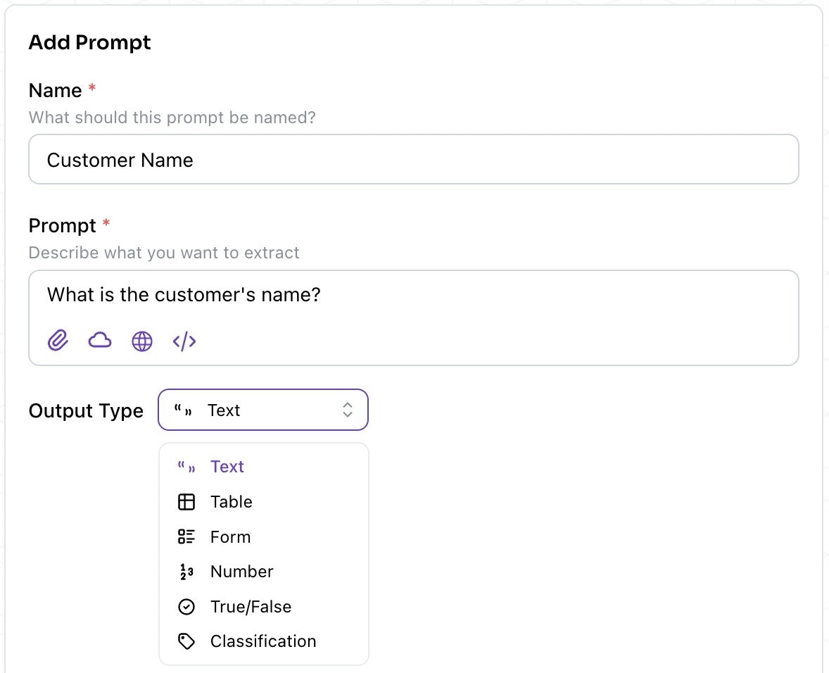 Adding a Prompt is as simple as asking (in natural language) what you’d want from the AI. Kolena will intelligently use the context it has to turn that request into a prompt that precisely guides the AI into extracting the relevant information from the uploaded documents. Once you’ve provided a description of what you’re looking for, you can:- Let Kolena auto-detect the output type (Create)